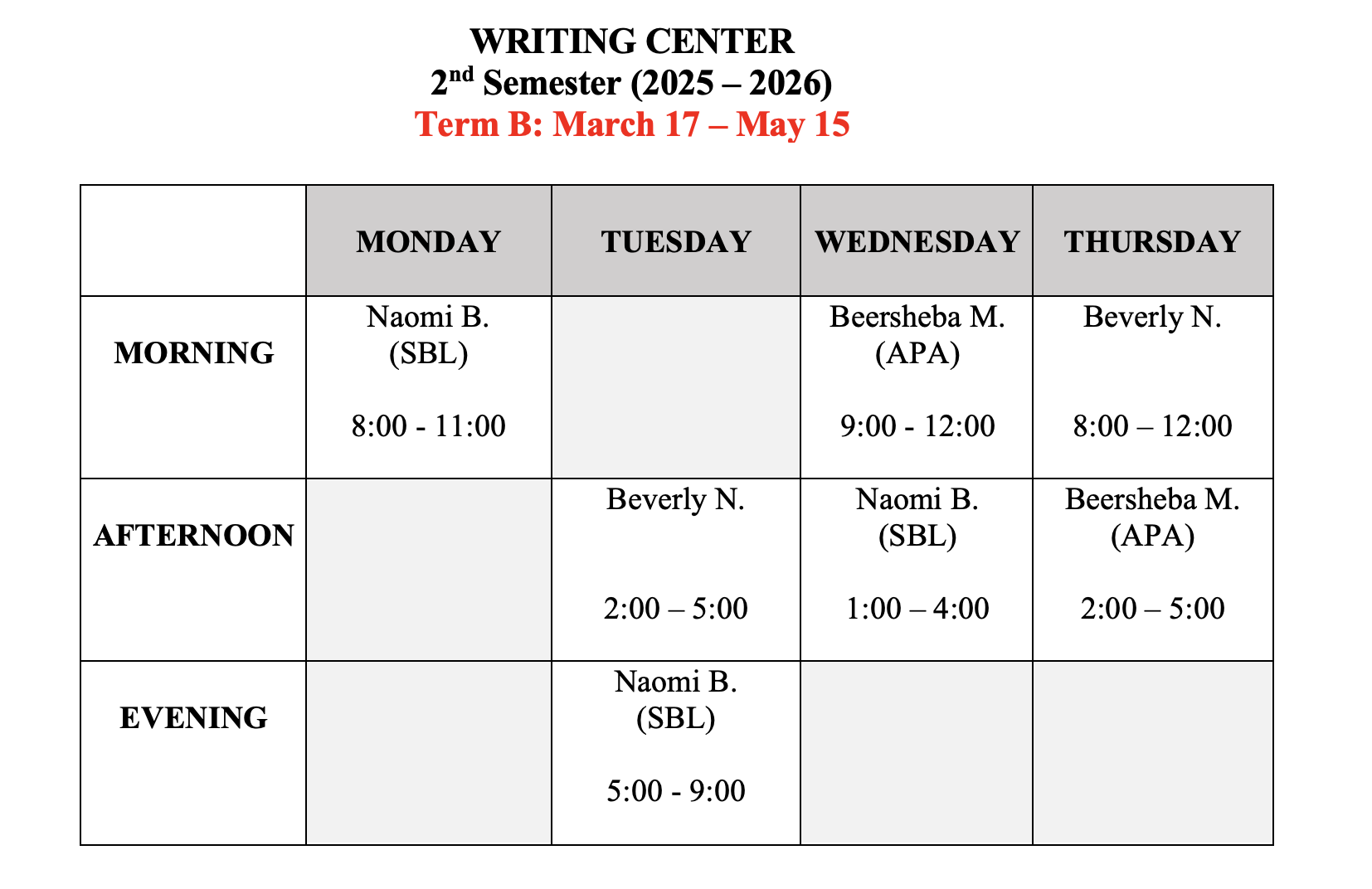 [online-students] Writing Center Schedule - Term B (March-May, 2026)